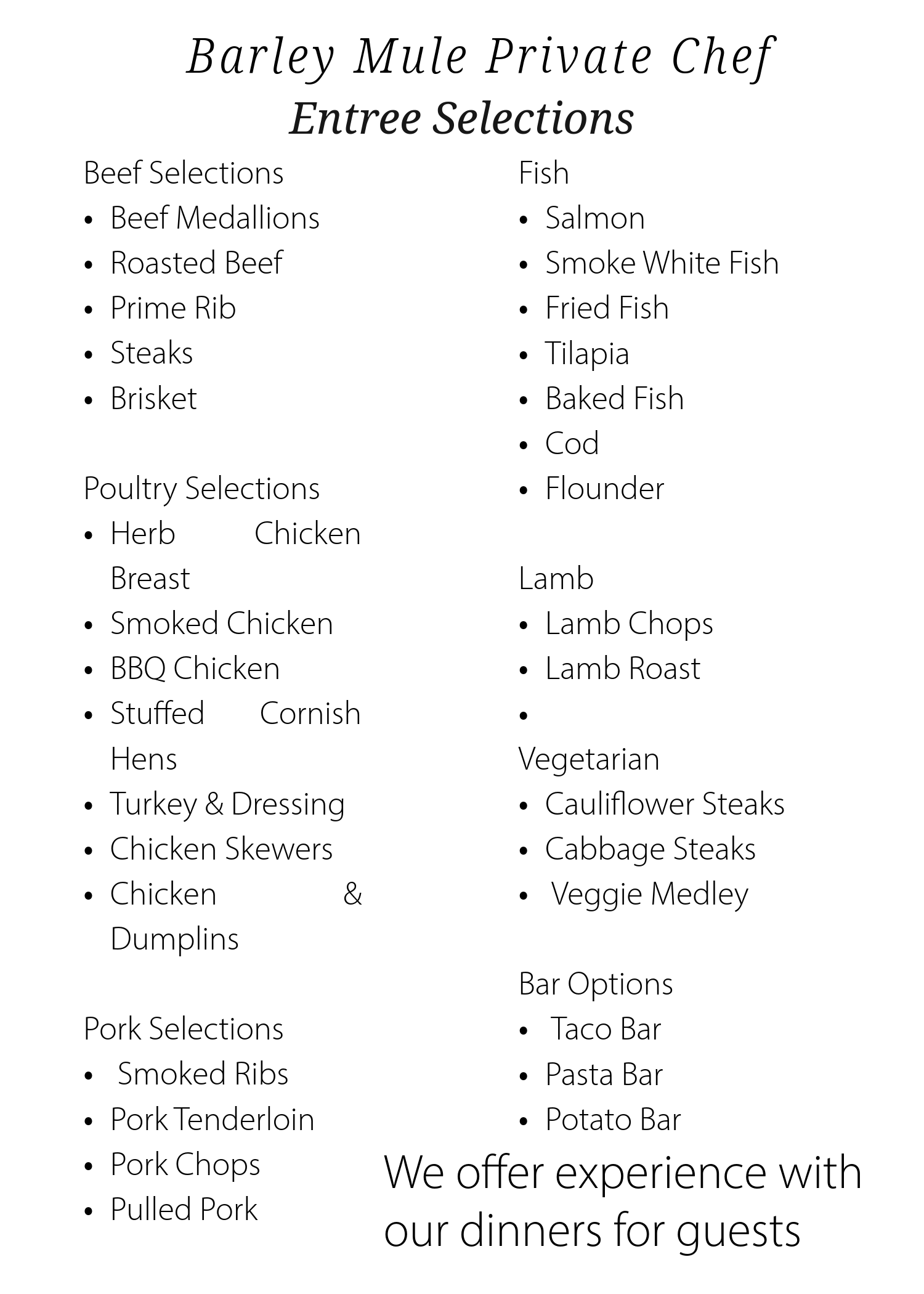 Tired of waiting in lines at Restaurants that have long wait times? Chef Isaacs and her team create unforgettable culinary experiences, bringing exceptional dining right to your cabin or event space. Whether you're planning an intimate dinner for two or a grand celebration at a local venue in Pigeon Forge, Gatlinburg, or Sevierville, Chef Isaacs crafts each meal with care and expertise. With a rich background in diverse cultural cuisines, she prepares an array of dishes that honor and celebrate her guests. The menu is filled with endless options of high-quality, flavorful dishes, leaving guests eager to return for more.